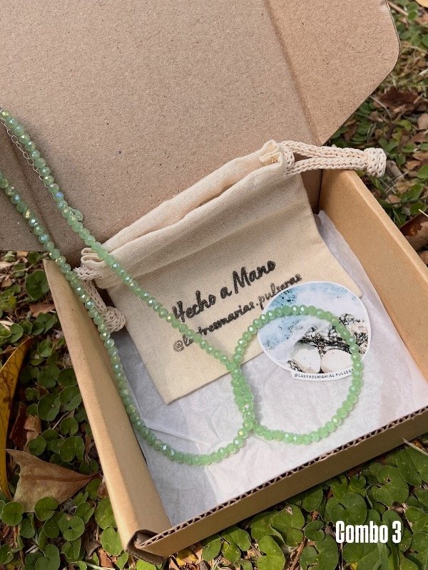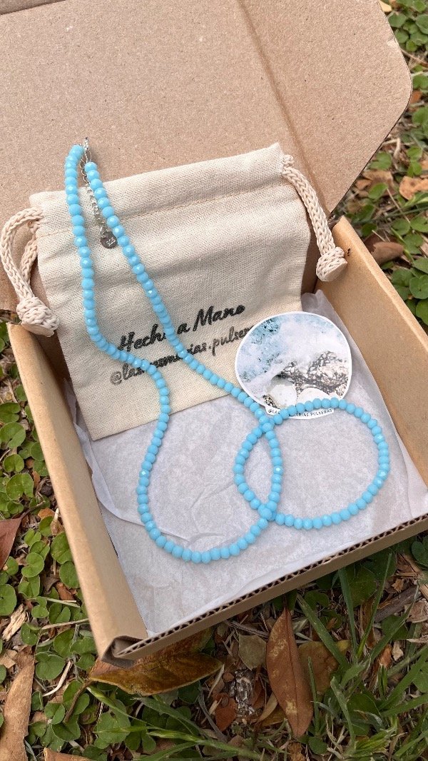Incluye un collar de cristal de roca con terminaciones en plata 925 y una pulsera elástica del mismo material. Un conjunto luminoso, delicado y versátil, ideal para quienes aman los accesorios energéticos y elegantes que combinan con todo.